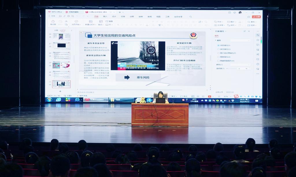 曹静就交通安全普法宣传为主题进行了宣讲。从“交通安全的概念和交通事故的危害”“大学生交通安全事故的主要表现形式”“大学生交通出行的风险点”“大学生交通事故的预防”四个方面,通过交通数据分析、典型案例分享的形式向同学们解读了校园交通安全相关知识,叮嘱同学们增强交通安全防范意识,做严格遵守交通法规的践行者。