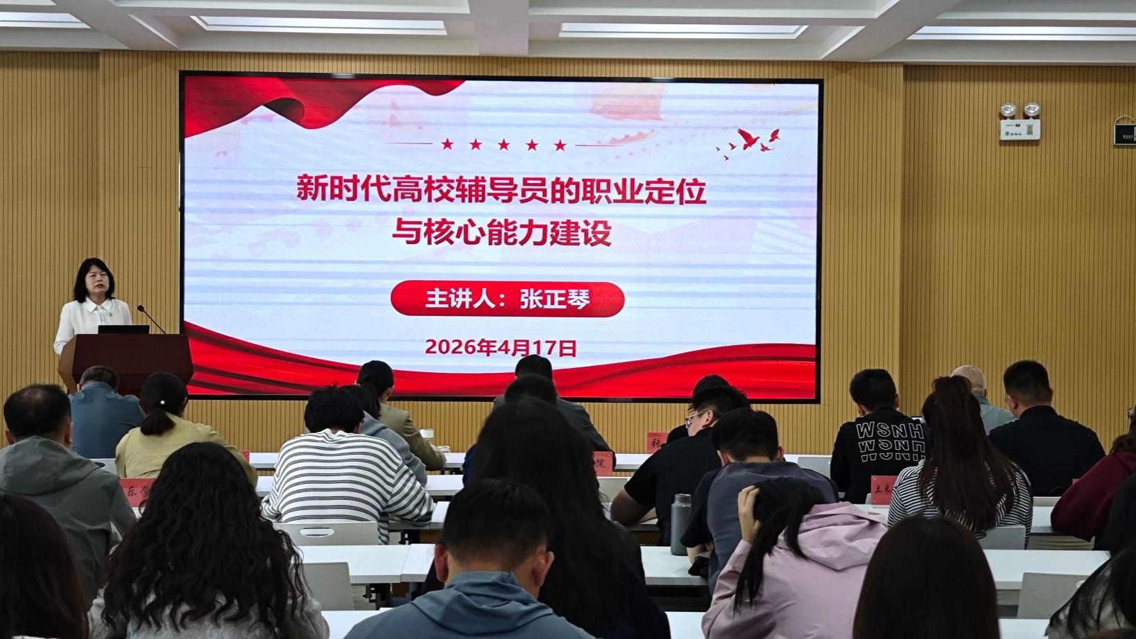 会上,甘肃省首批辅导员名师工作室主持人张正琴作题为“新时代高校辅导员的职业定位与核心能力建设”的专题报告。她紧密围绕当前高校思想政治工作的新形势与新要求,从“为何重要、究竟是谁、必须会什么、如何变强大”四个方面,系统阐释了新时代辅导员的角色内涵、价值使命与成长路径。她指出,辅导员要始终坚守“学生成长引路人”和“知心朋友”的双重定位,避免陷入日常事务而疏离育人本责;重点提升思想引领力、数字胜任力、危机处置力、发展指导力四大核心能力,将“问题变课题、做法变方法”,有效回应了新时代学生工作的现实挑战。报告内容深入浅出、紧扣实际,既有理论高度,又具实践温度,为辅导员的专业化、职业化发展提供了清晰指引和有力支撑。