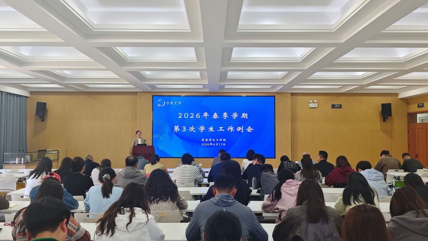 4月17日,学校召开2026年春学期第三次学生工作例会暨首场辅导员提质赋能培训会。党委教师工作部、学生工作部负责人,省级及校级辅导员名师工作室主持人、学生工作部工作人员、各二级学院学工办主任及辅导员等100余人参加。
